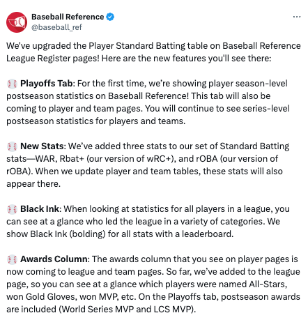 Updates have already been made, including the Player Standard Batting table on Baseball Reference League Register pages.